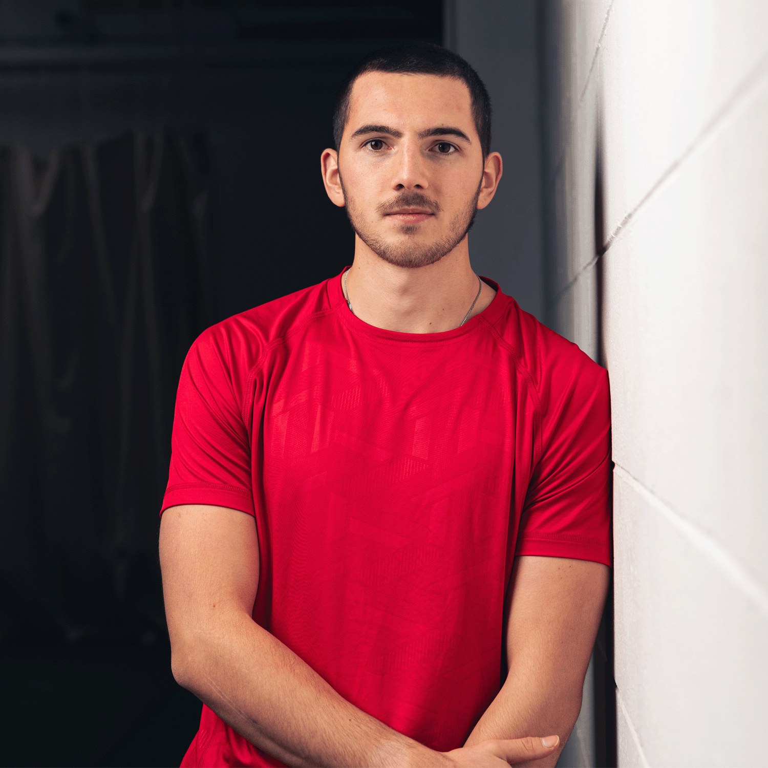 Crew neck fitted polyester interlock material with highly modern print to the from panel